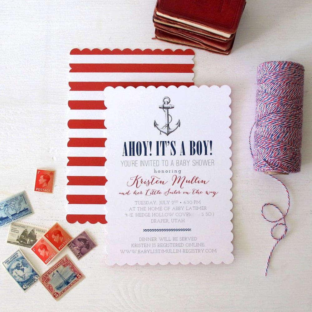 Baby boy on board? Celebrate the upcoming sailor with a nautical party suited for any first-class mama. Lovely fonts featured in red, gray, and navy hues help this two-sided invitation stand out from the rest.